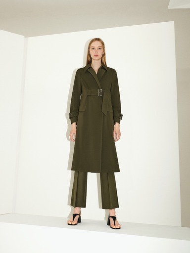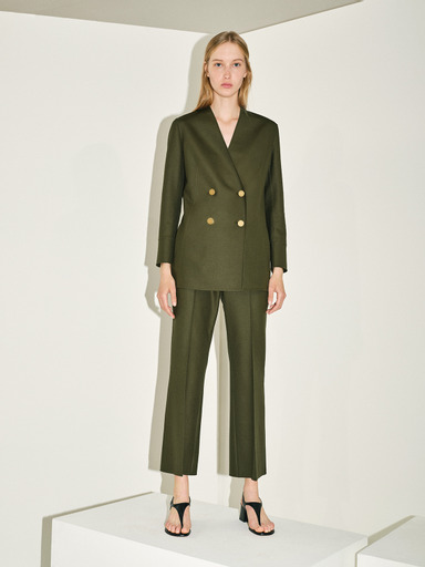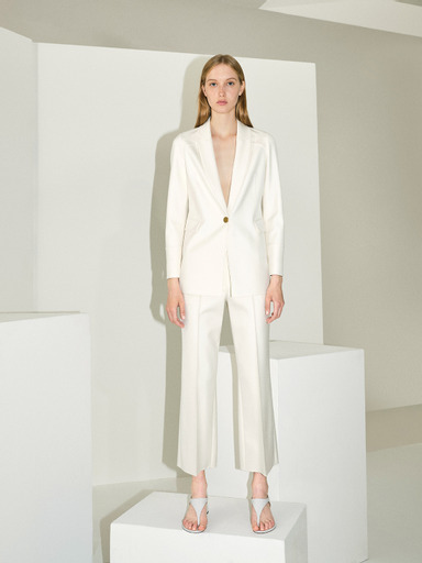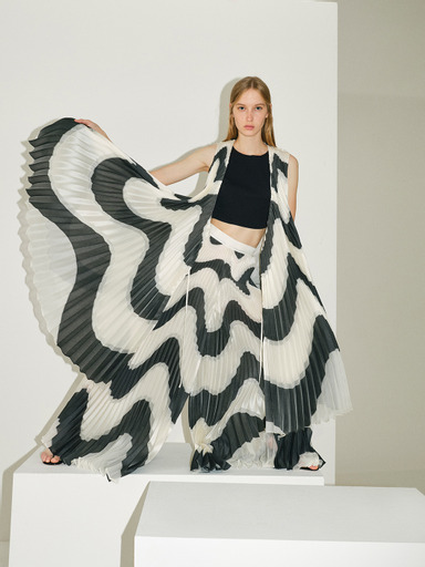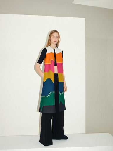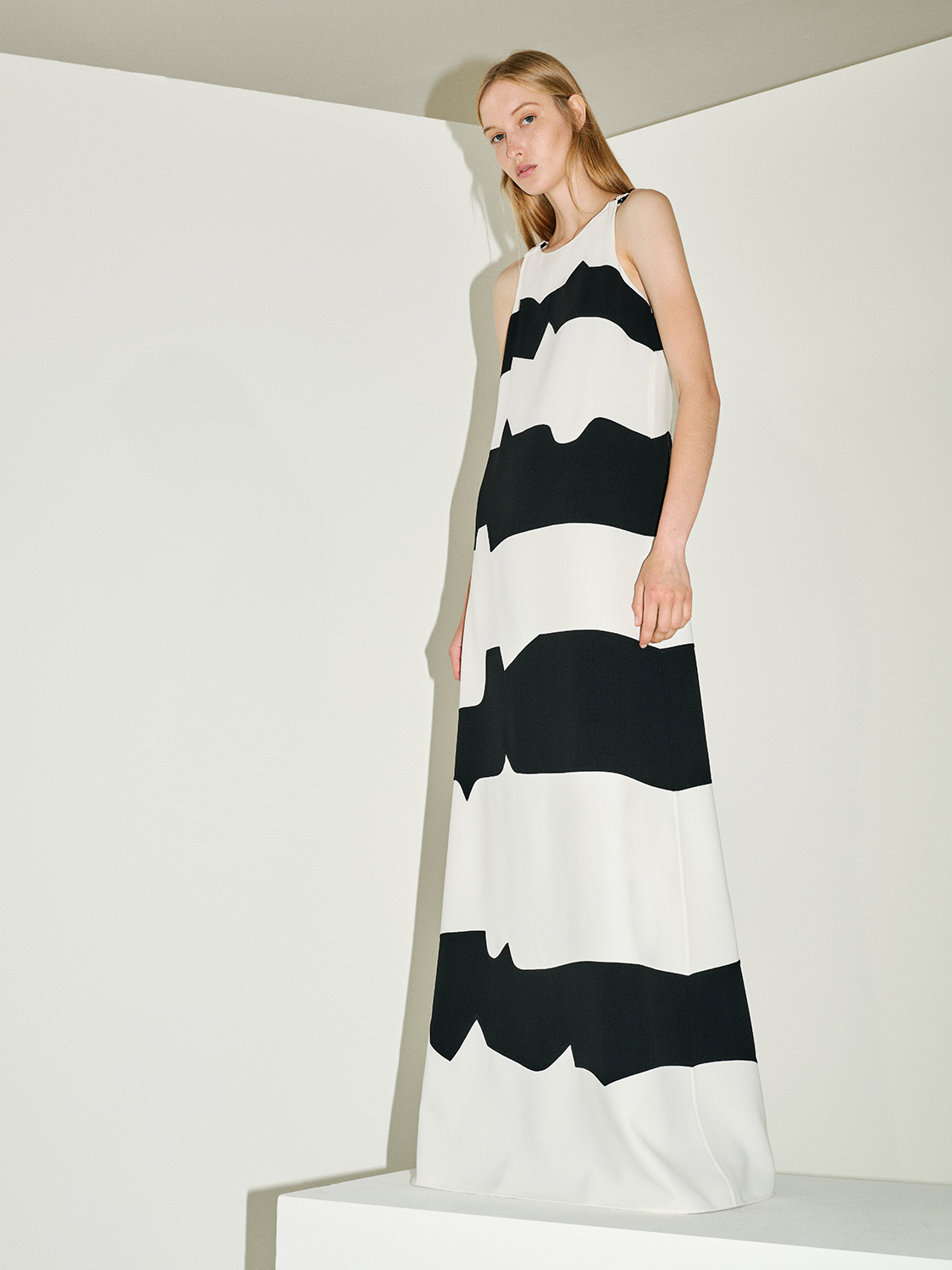 La palette dei colori muove dai classici bianco e nero a note intense di verde oliva per poi accendersi in toni brillanti di peonia e corallo; sequenze elettriche di bianco, arancio, peonia, senape, blu scuro, smeraldo e nero creano ritmo cromatico su superfici nette. I materiali hanno corpo e leggerezza; double di tela crêpe ultralight, slow silk double, faille di cotone e viscosa, crêpe de chine, popeline stretch di cotone, organza jacquard fil coupè.