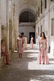 La collezione “mare” — che anticipa il prossimo debutto della linea beachwear — presenta piccoli pezzi, costumi, hot pants sartoriali, bustier e prendisole in fresco sangallo bicolor (rifinito con pizzi e punto ajour nei toni del corallo o del celeste), alternati a outfit dello stesso tessuto ma di un blu profondo. Anche l’underwear in tulle e morbido jersey è perfettamente coordinato.
