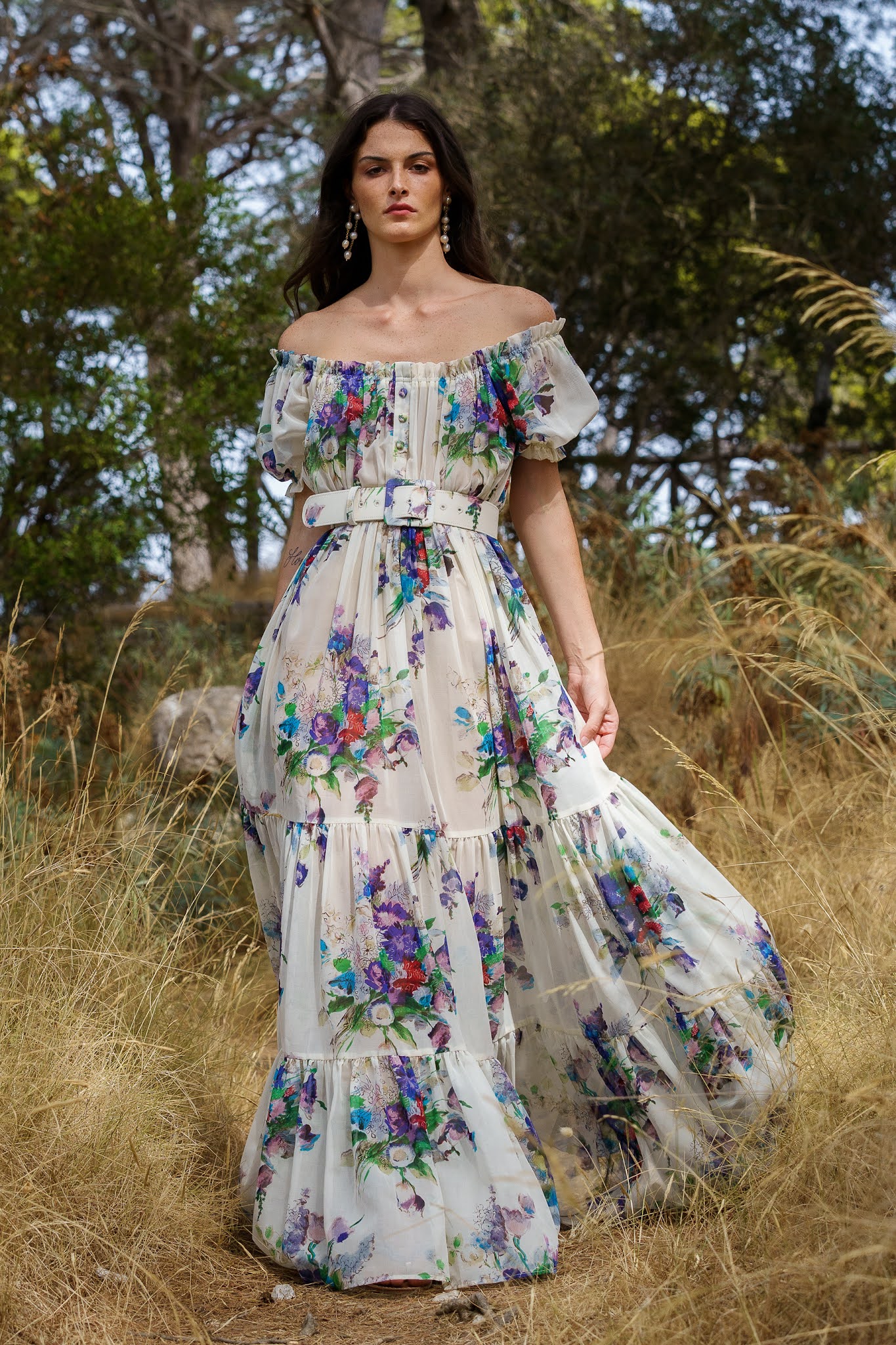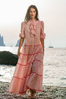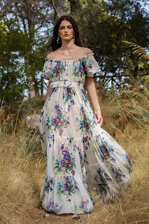 Come uscite dal mito, donne sirena, muse e ninfe si vestono di fantasie minute e bagliori fioriti con profonde scollature, oppure con versatili e impalpabili caftani a balze. L’effetto trompe-l’oeil crea fini giochi prospettici per gli spezzati composti da short con brassiere, gonne a corolla con bluse e maxi gonnelloni a volant, che sembrano one-piece-dressriletti in chiave moderna. Mini, maxi o al ginocchio, gli abiti fluidi e gli chemisier si arricchiscono con piccole rouches e maniche morbide e arricciate, un omaggio alla forme della natura pensato per ogni summer occasion: si respira aria di vacanze, in barca così come in campagna.