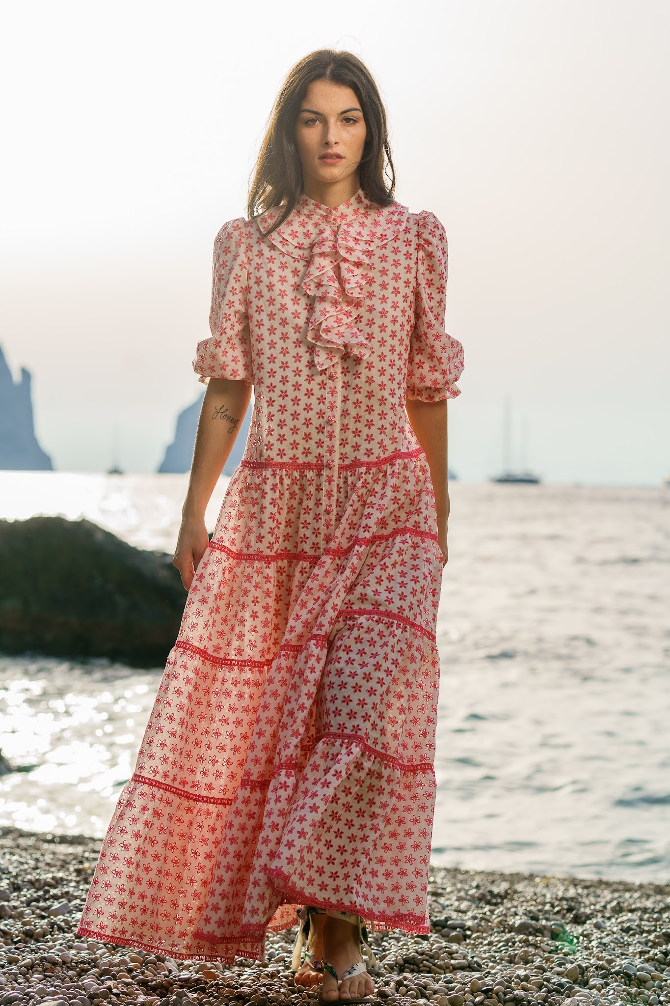 Agli abiti fanno da contrappunto romantici e funzionali cappelli a falda larga, shopper e teli mare in cotone o spugna, stampati con gli stessi motivi e nuances. La linea accessori si completa con cerchietti, fasce larghe in tessuto, flat ribbon sandal che si allacciano alla caviglia e catene funky realizzate a mano da artigiani capresi.