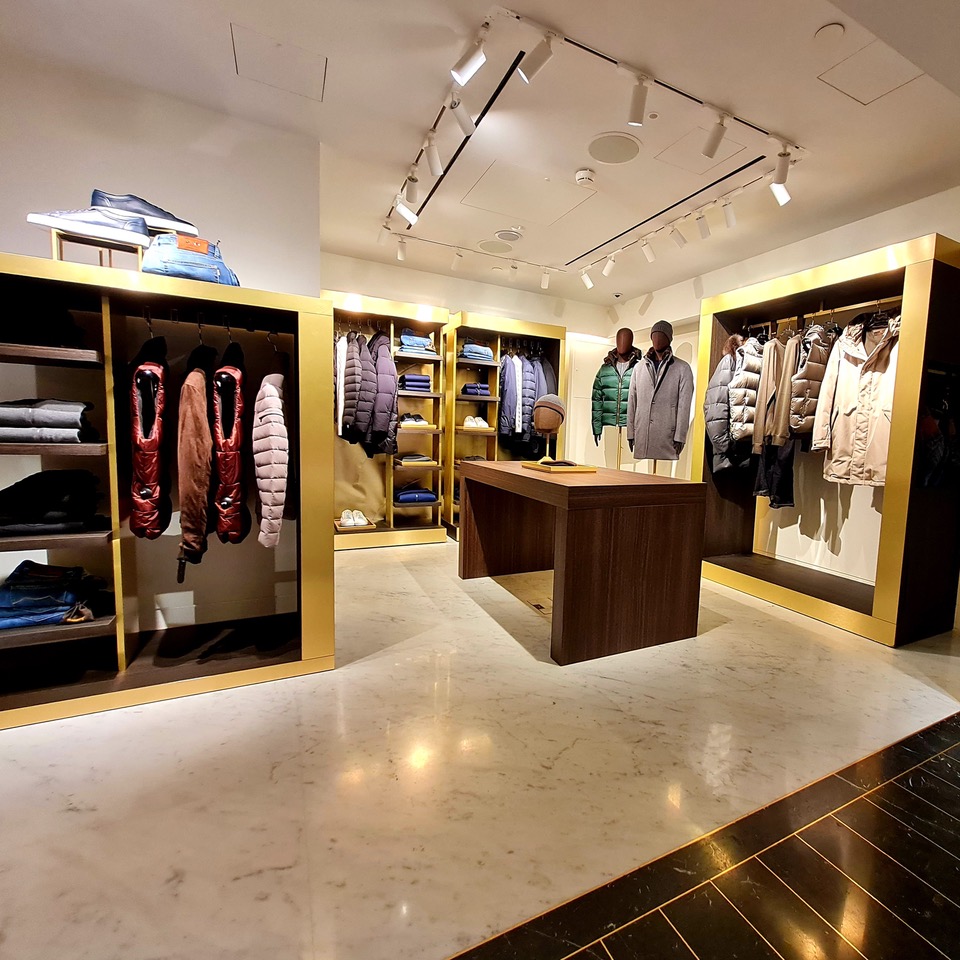 Il negozio di circa 30mq è collocato al secondo piano del department store, recentemente rinnovato e dedicato al luxury international menswear, e riprende i colori scuri caratteristici dei flagship del brand, alternati alle finiture ottone mat degli scaffali e al marmo lucido con grandi venature dei pavimenti.