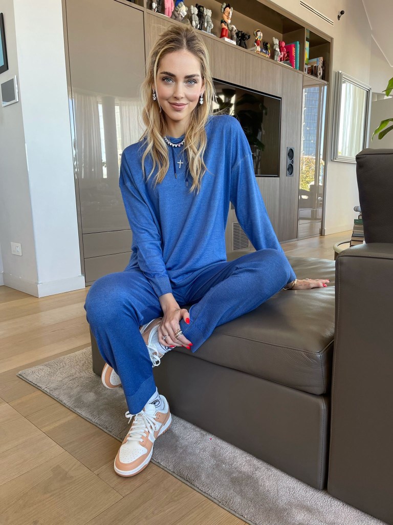 La tuta scelta da Chiara – felpa con cappuccio e pantaloni abbinati- diventa capo hero della primavera per la sua trasversalità, unendo forme e punto cromatico di ultima tendenza, identificato nella tonalità Mare Dark Sfumato.