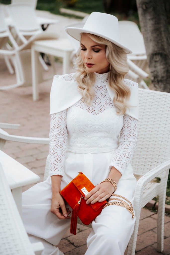 Dalla sofisticata palette della collezione, con tonalità che variano dal rubino al rosso persiano, fino ad arrivare aitoni più chiari e luminosi dell’oro, del bianco e dell’avorio, prendono vita abiti sartoriali in seta, tute con tagli simmetrici, camice in pizzo e pantaloni palazzo, che esprimono un’eleganza senza stagione.