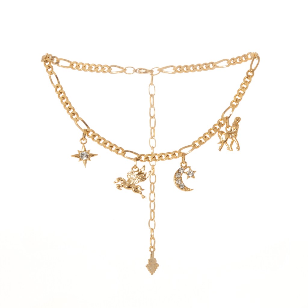 The Juno, è il modello che più di ogni altro è ispirato alla mitologia e al mondo delle costellazioni senza dubbio dedicato a chi crede nelle stelle. Un astro lucente, un pegaso che rinvia alle più antiche costellazioni boreali, una luna e una donna centauro che rimanda al potere femminile, all’emisfero australe e a uno degli insiemi di stelle più luminosi di sempre. Cristalli preziosi e placcatura 18K, per un choker carico di significati.