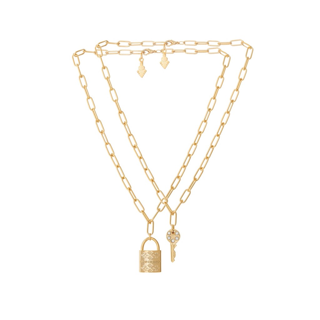 Me&YOU, tra tutti i simboli, la chiave è un particolare portafortuna che auspica proprio l’apertura di nuove porte, nonché inedite strade da percorrere, ma se è abbinata al lucchetto la svolta romantica è assicurata. Doppia catena placcata 18K dalle magli squadrate, molteplici punti luce e una scritta segreta incisa sul retro“I am owned” per un girocollo che promette giorni appassionati.