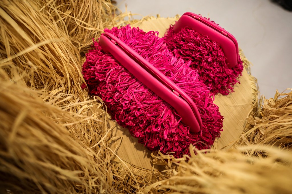 Per questa capsule collection i due modelli iconici di THEMOIRè sono stati realizzati in 100% rafia, completati dall’iconica cerniera in vegan PU. Inoltre la rafia proviene da una palma tropicale endemica di provenienza locale e la sua raccolta è un processo simile alla potatura, che contribuisce alla salute generale della pianta. Le fibre ottenute attraverso questo processo sono eccezionalmente elastiche e durevoli. Maxi frange, una texture mossa e riccioluta, oltra a una versione crochet che ingloba piccole sfere metalliche, caratterizzano questi accessori presentati in toni naturali, buganville e giallo vivido.