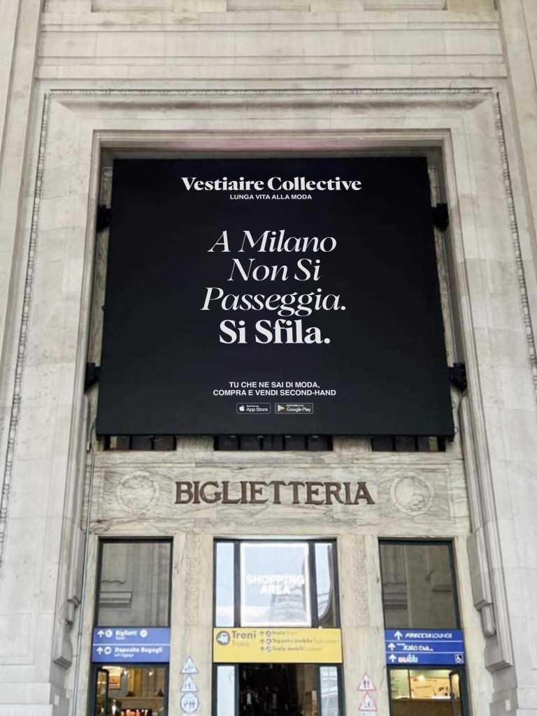 “Non è brutto. È ugly chic.” recita un’altra, giocando con la ricerca quasi ossessiva dell’inglesismo da parte dei milanesi. Un altro dice “Salviamo la Terra. È l’unico pianeta con Miuccia.”, unendo sostenibilità e passione per il fashion, elementi comuni a Vestiaire Collective e al suo target.