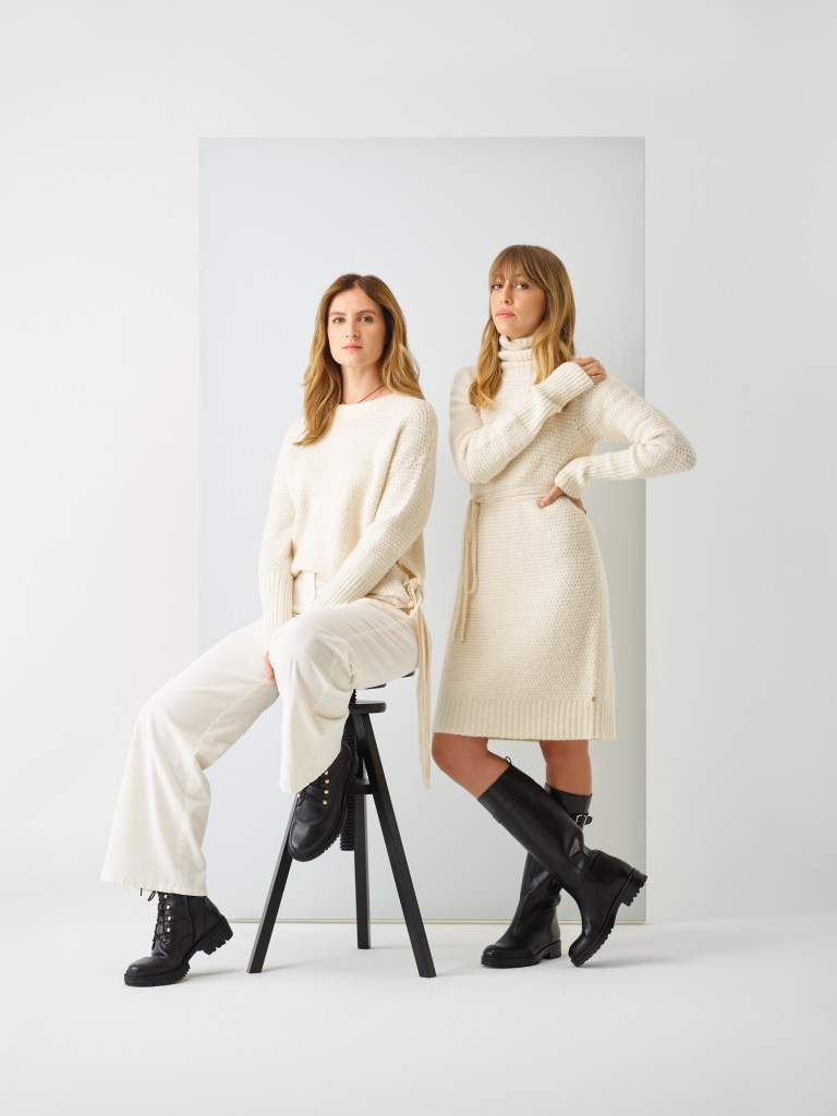 Pull, cardigan e abiti in maglia offrono sensazioni tattili morbide e avvolgenti. Le tradizionali lavorazioni nordiche si arricchiscono di motivi di infilature dal sapore folk. La purezza del bianco caldo è esaltata da punti tridimensionali, mentre senape e cammello si mischiano in fantasie chiné e righe jacquard. Toni rosati diffondono vibrazioni positive, i colori di oceani e lagune portano orizzonti sconfinati nei nostri scenari quotidiani.