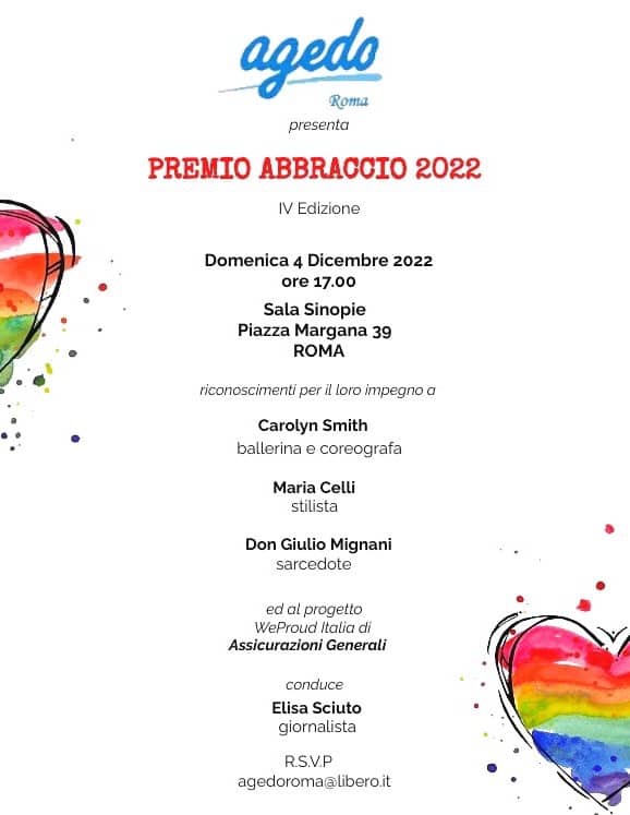 Il Premio Abbraccio 2022 viene consegnato, quest’anno, alla ballerina e coreografa Carolyn Smith, alla stilista Maria Celli, a Don Giulio Mignani ed al WeProud Italia di Assicurazioni Generali.