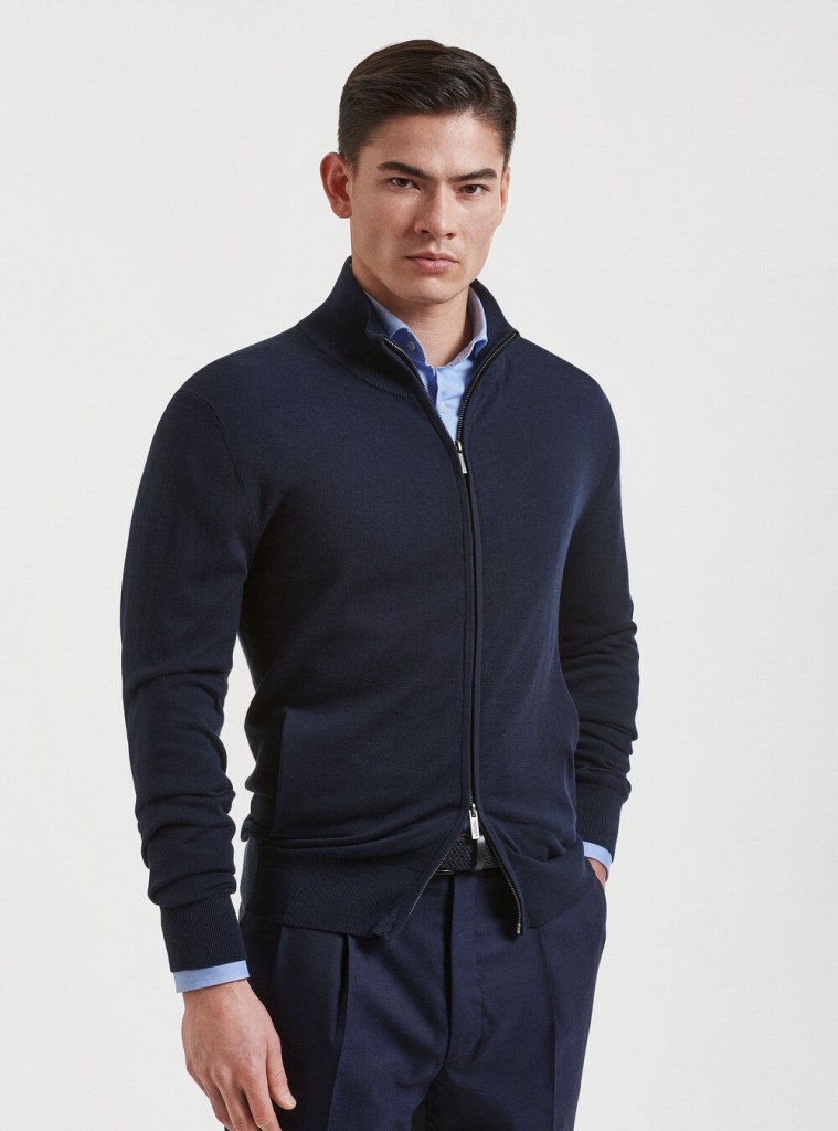 Altro passe-partout è la maglia full zip in puro cotone extrafine. Caratterizzata da vestibilità regular, ha due tasche laterali e finiture a costine. Perfetta con il blazer e con il denim, è disponibile in due varianti colore: blu navy e grigio mélange.