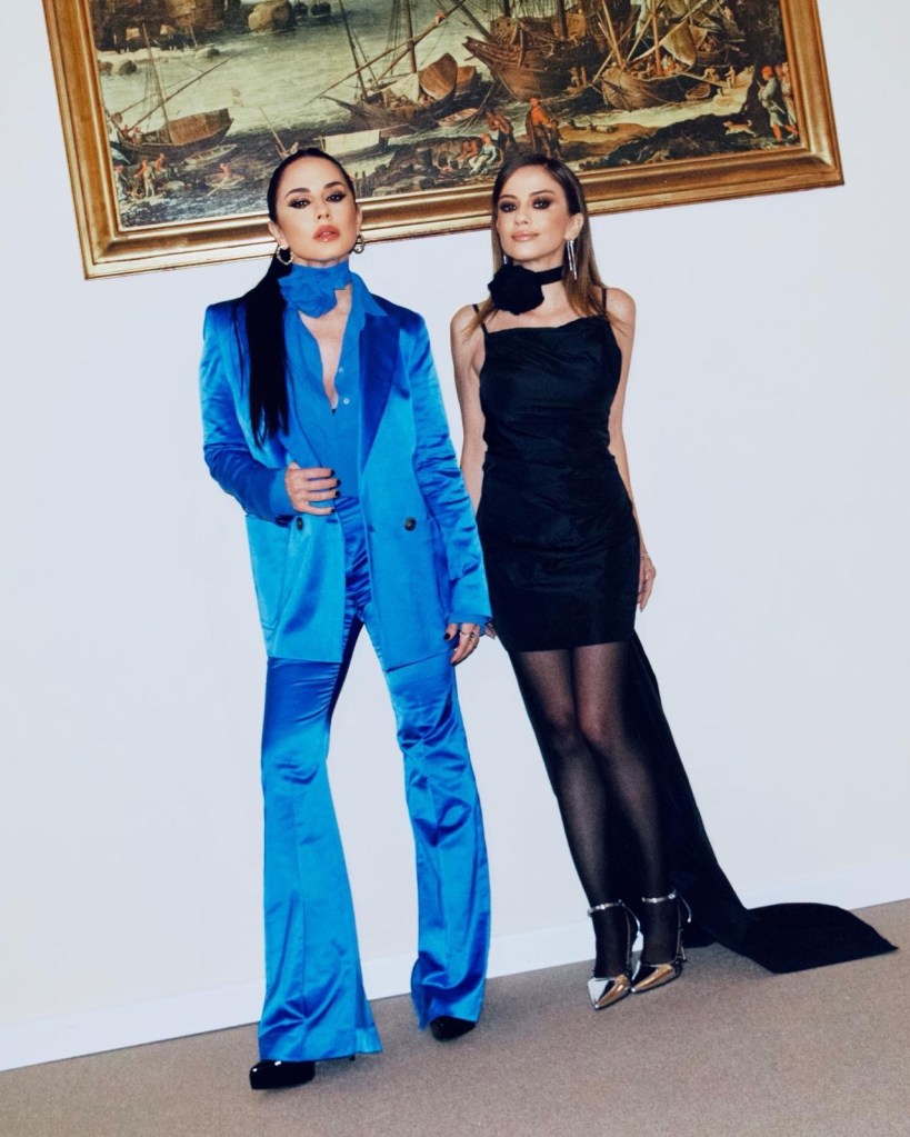 In prima serata Paola ha indossato il blazer, hero Item del brand, in versione doppiopetto blue, abbinato a pantaloni in satin shiny. Per Chiara Marella ha scelto un look caratterizzato da un mini black dress con strascico.