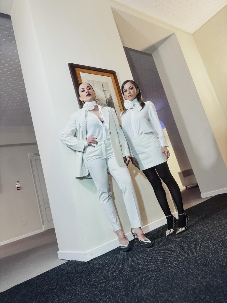 Paola ha indossato suit sartoriali androgini e cool, Chiara ha scelto look Marella iper femminili e caratterizzati da cortezze e dettagli importanti. In entrambe le serate Paola&Chiara hanno completato i look con il choker maxi-fiore, accessorio glam in crêpe de chine in più colori.
