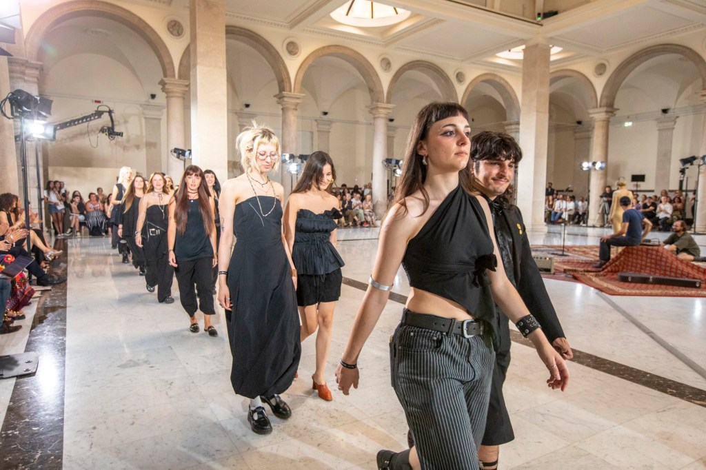 “Per il secondo anno, abbiamo portato in passerella i lavori degli studenti che frequentano il Triennio di Fashion Design nel campus di Roma. Anche loro, attraverso le collezioni realizzate che abbiamo visto in passerella allo Spazio Vittoria, hanno esplorato le loro abilità sperimentando, spaziando dalla sartoria tradizionale e industriale alle tecniche artigianali applicate al tessuto, sino alle sperimentazioni con l’ausilio dell’Intelligenza Artificialecoinvolgendoci con creazioni originali”, ha commentato Colomba Leddi, Fashion Design Area Leader.