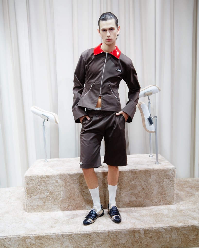 Il clic penetrante di una penna, i colpi affrettati della tastiera che risuonano nella dolce lontananza e il suono aziendale che echeggia le luci fluorescenti dall’alto avvolgono l’ispirazione della stilista per la SS25, trovando un conforto familiare nella prevedibilità degli ambienti aziendali quotidiani, banali e beige. La curiosità e l’ispirazione di Sarca l’hanno portata nelle strade affollate di Londra e hanno indirizzato la sua attenzione verso ciò che tutti indossiamo quotidianamente: abiti dai colori scuri, tute monocromatiche, t-shirt nere e grigie, abbinate a uno spettro personale di calzature, dalle comode Crocs in bianco clinico alle morbide Clarks Wallabees in suede nei toni del beige terroso.