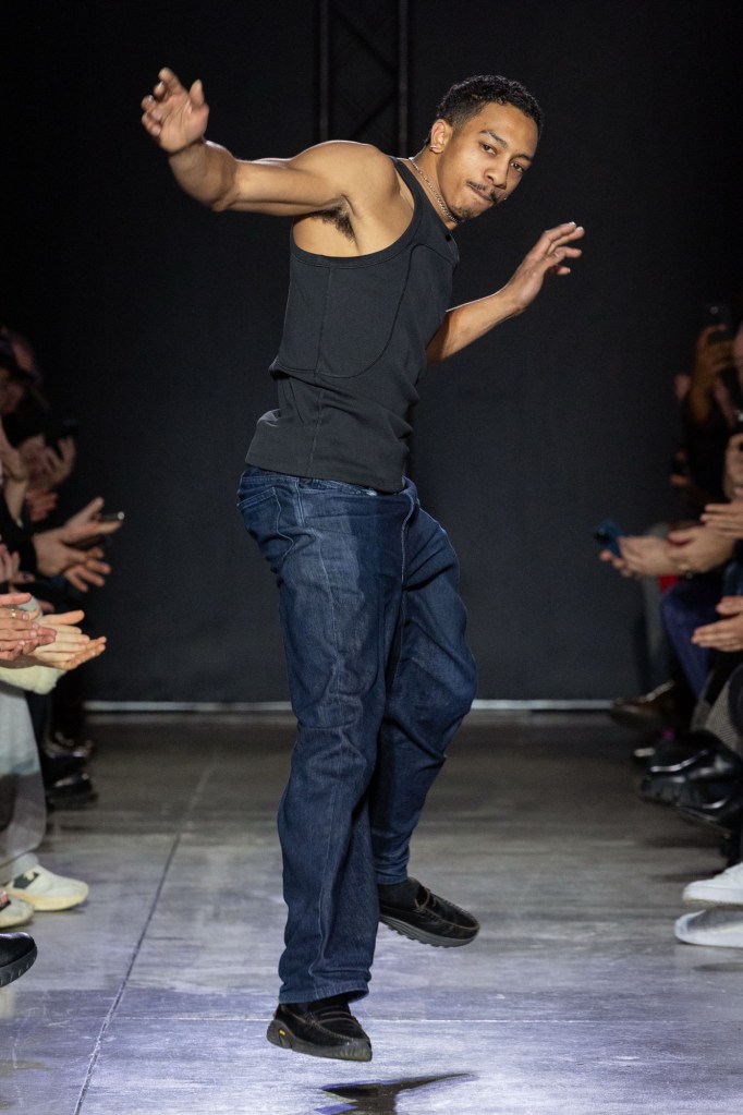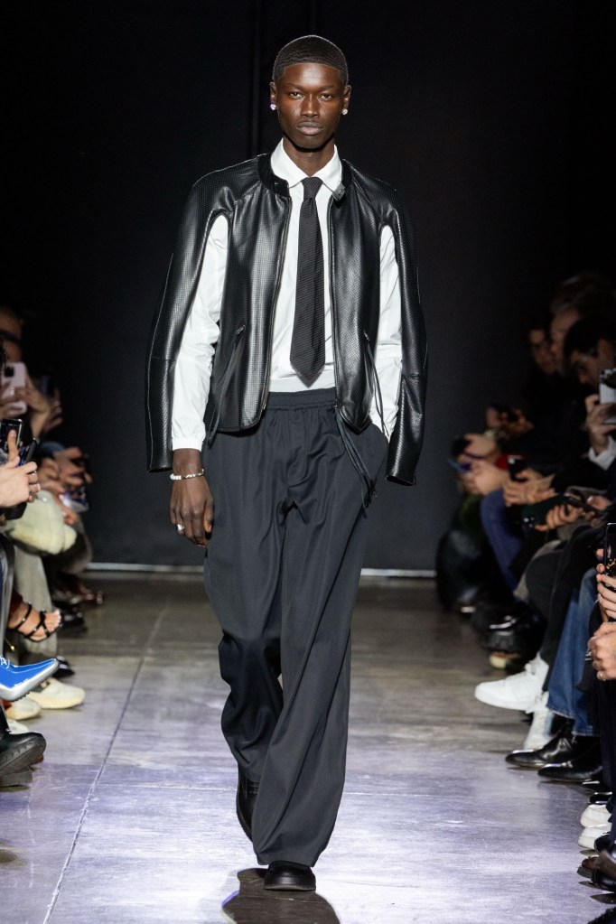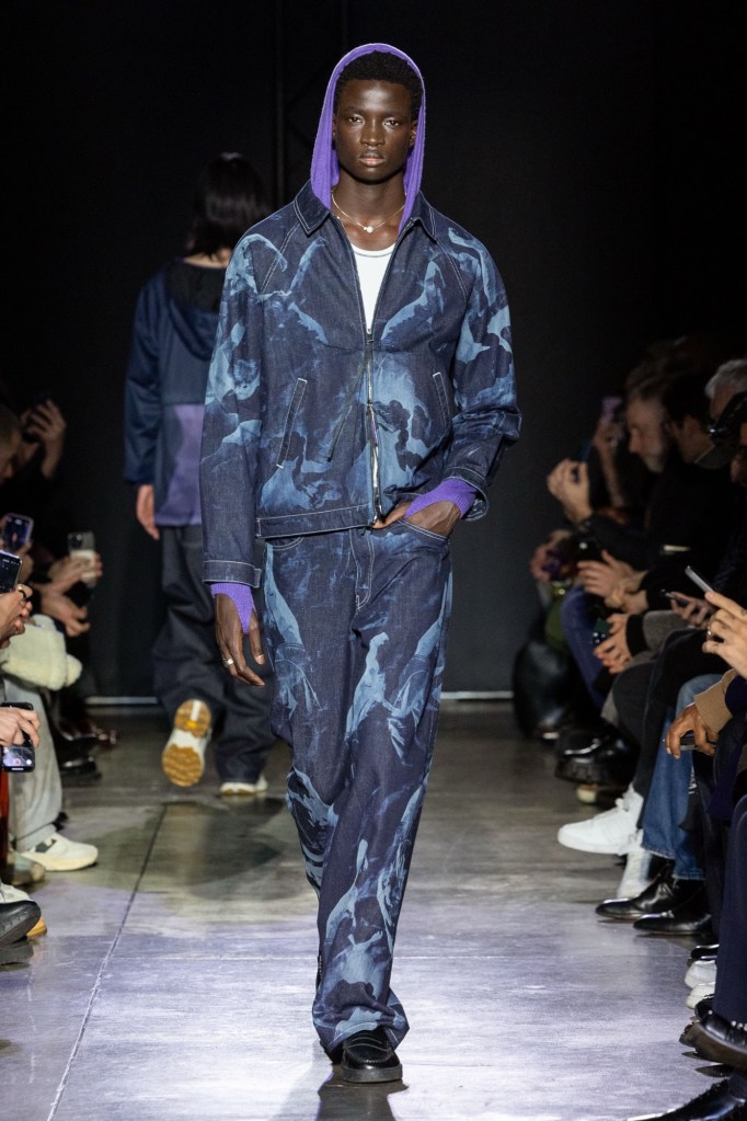 L’intera collezione è costruita ponendo al centro l’aspetto funzionale dei capi, i tagli favoriscono il movimento e questa tecnica viene applicata a tutti i fondamentali dell’abbigliamento maschile, non solo ai pezzi dal vibe più sportivo. Per esempio, una giacca in Japanese Kaihara denim, viene accostata a jeans senza cuciture. L’intero outfit è caratterizzato da un printsfumato realizzato attraverso l’uso di un’innovativa tecnica laser. Questa stampa riproduce l’effetto di corpi in movimento rimandando a una serie di immagini che, da sempre, ispirano il designer per la loro spiritualità.