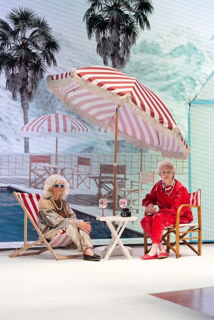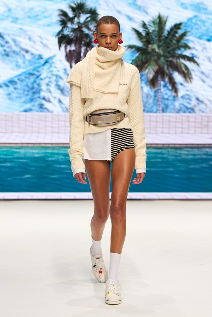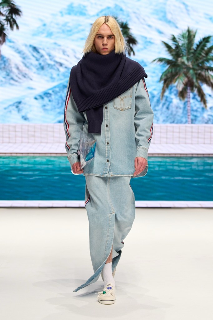 Il tailoring classico incontra materiali futuristici, unendo lana gessata, chevron e crêpe de Chine in seta pastello con lattice naturale ultra-lucido, carta trattata come tessuto, PVC riciclato e neoprene morbido, dando vita a silhouette inaspettate. Le stampe sfidano le convenzioni stagionali, spaziando da fiori hawaiani e paesaggi di Portofino a pin-up sulle piste da sci e agli eterei angeli Fiorucci che fluttuano tra nuvole di chiffon, nella Beatitudo Print.