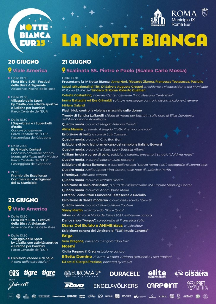 Un weekend di festa dalle atmosfere estive, con negozi aperti e strade chiuse al traffico, e con l’Eur che s’illumina a giorno per la prima notte che apre la bella stagione. Il tutto coordinato dall’amministrazione sotto l’effigie di Eur District, primo brand municipale lanciato dalla presidente Titti Di Salvo e dal vicepresidente Augusto Gregori. Un’idea nata guardando a città come Londra, Berlino, Parigi, per dar valore a realtà commerciali e artistiche, ma anche al mondo della notte e ai tanti grandi eventi che ogni sera animeranno il IX Municipio per il periodo più caldo dell’anno. La Notte Bianca dell’Eur, è dunque la porta d’accesso all’estate 2025 per gli abitanti di un quartiere che Di Salvo e Gregori hanno spesso definito come “storicamente contemporaneo”,proiettandolo verso un’immagine più attuale ed europea.