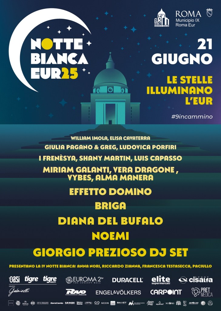 La Notte Bianca dell’Eur è realizzata con il sostegno di: Eur Spa, Ama, Polizia Locale IX Gruppo, Croce Rossa, Protezione Civile, Ninfeo, ZeroCento, Neon, Carpoint, Cisalfa, Elite, Baxet, Room 26, Duracell, Euroma 2, Ravo Italia, Pret Medica, Eur Social Park, Fiesta, Cinecittà World, Hilton Rome Eur La Lama, Gruppo Gabrielli, Dabliu Fitness & Sport Club, Mirko Marini Osteopatia, Aquamed, Engel&Volkers, Gregor e AllRound.