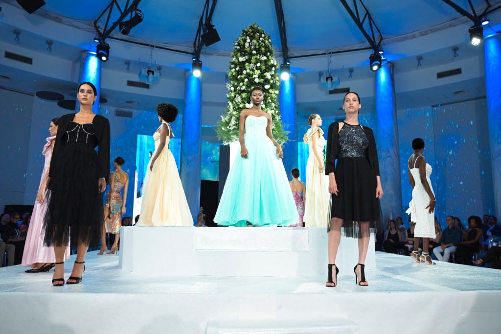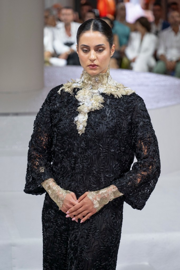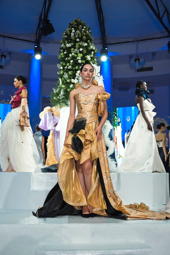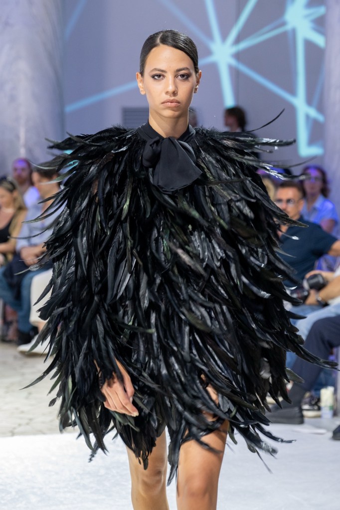 A chiudere la kermesse Nino Lettieri che ha presentato la sua collezione Alta Moda A/I 2025/2026, con otto creazioni total white e sette, in contrapposizione, total black.
